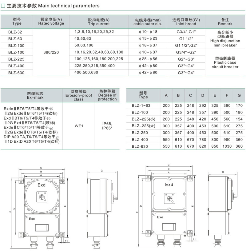 BLZ防爆断路器开关箱防爆电器厂家支持非标定制。防爆断路器可以用来分配电能,适合不频繁地起动异步电机,具有过载、短路、欠压保护功能,当发生故障时可以自动切断电源。隔爆型外壳把可能产生火花、电弧和危险温度的部件与外部隔开,从而达到防爆的目的。